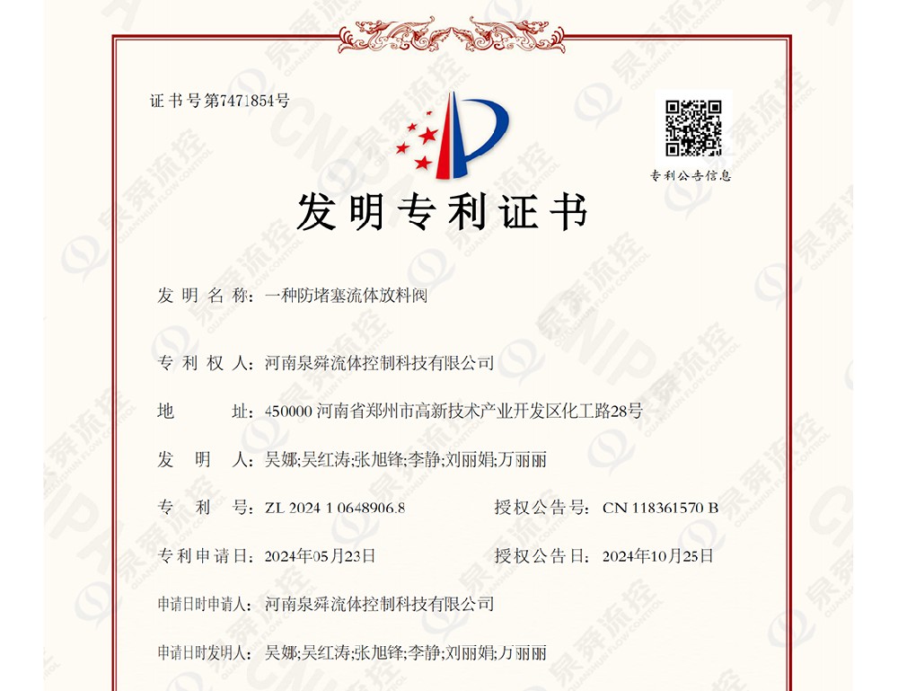 在这个科技日新月异的时代,每一步创新都是推动行业发展的强大动力。泉舜流控凭借卓越的研发实力和不懈的创新追求,成功获得了国家知识产权局颁发的发明专利证书,专利名称为“一种防堵塞流体放料阀”(专利号:ZL 2024 1 0648906.8)!🔍技术革新,破解行业难题 &nbs