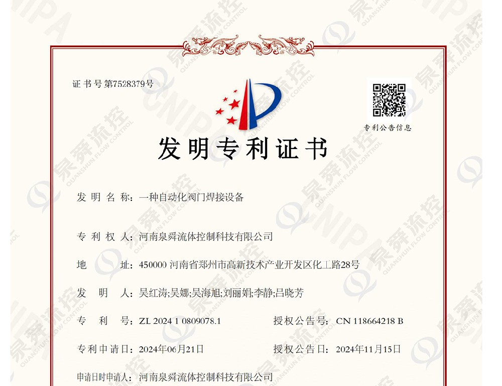 日前,由我公司自主研发的《一种自动化阀门焊接设备》,专利号为ZL 2024 1 0809078.1获得国家发明专利,为公司科技创新再添硕果。泉舜流控革新阀门焊接技术,引领自动化新篇章,标志着泉舜流控阀门制造智能化水平又迈上了新台阶。🔧技术革新,精准焊接🔧 该发明聚焦于阀门焊接过程中的精